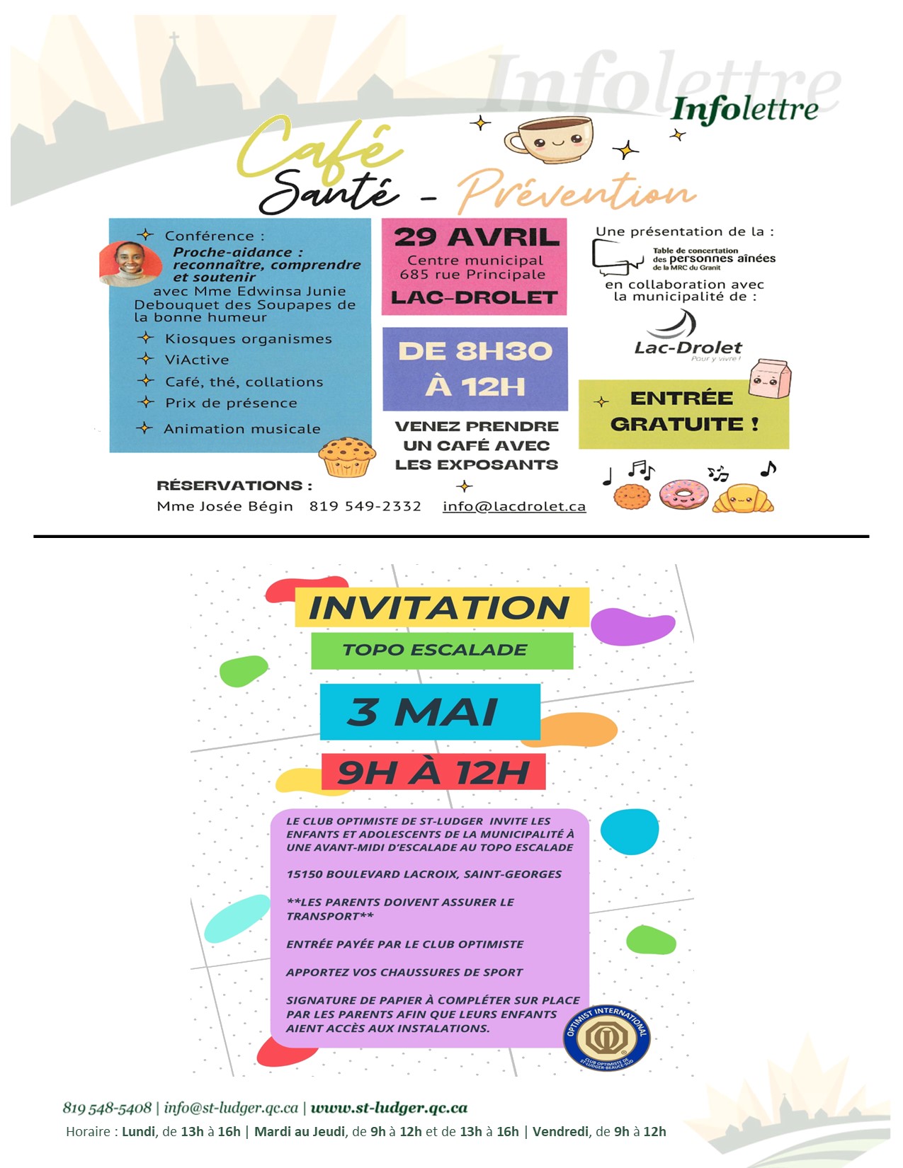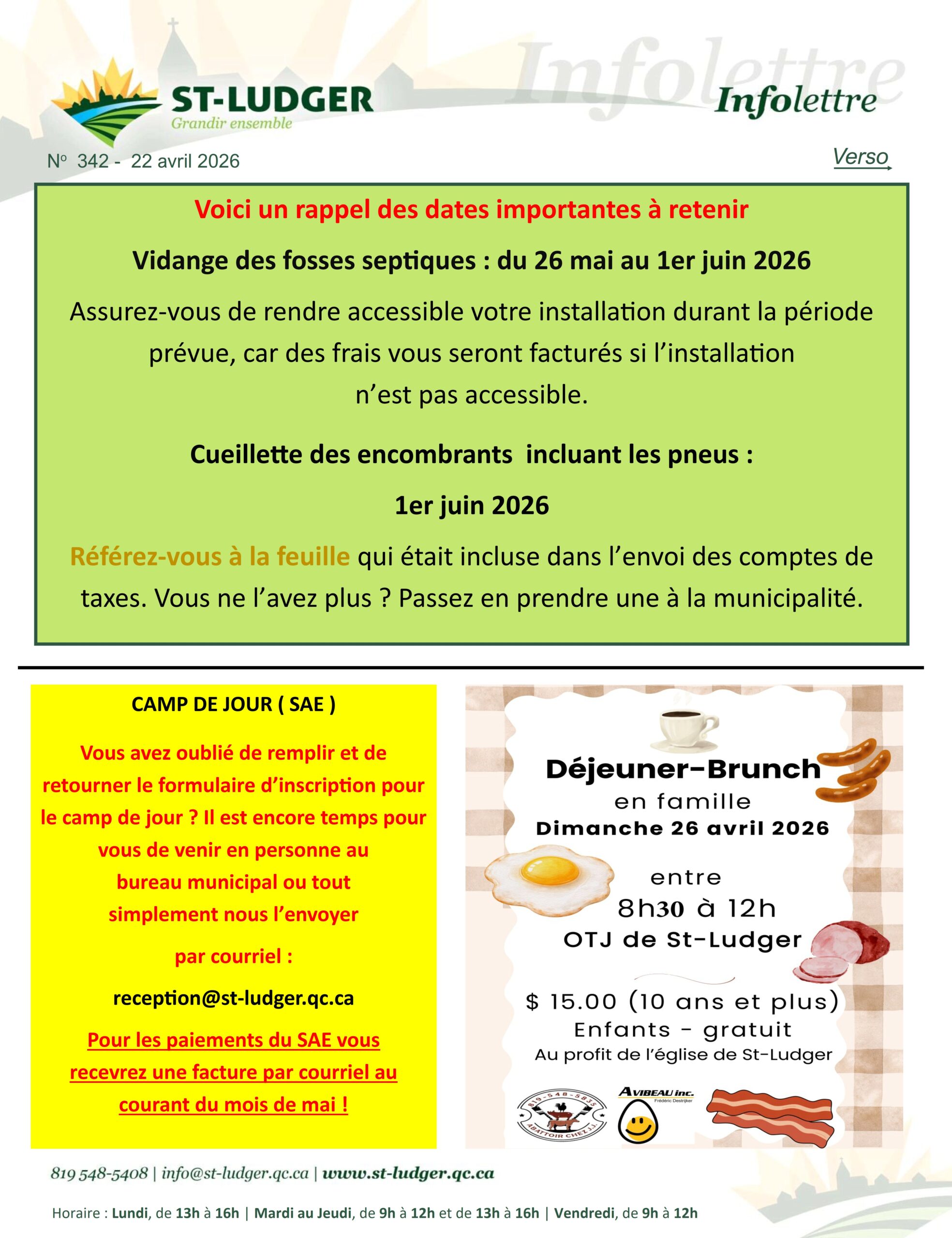 Retrouvez aussi l’Infolettre sur notre page Facebook au https://www.facebook.com/municipalitesaintludger 22 avril 2026 Partager cette publication Partager sur FacebookPartager sur Facebook Share on XPartager sur X Partager sur PinterestPartager sur Pinterest Partager sur LinkedInPartager sur LinkedIn Navigation articlePrécédent Article précédent :Séance ordinaire du conseil municipal